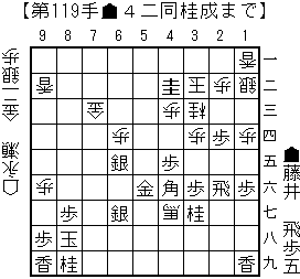 bonanzaの読み:△3二玉(42)▲5二香成(55)△9七桂成(85)▲同歩(