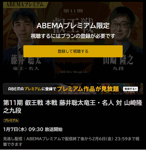 ・通常のABEMA将棋チャンネルでは午前中まで放送(視聴無料)。